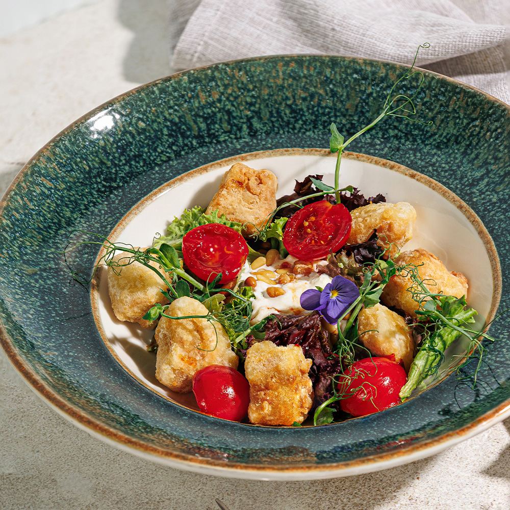 Хрустящий жареный баклажан фри с фермерским сливочным сыром страчателла на миксе салатов с томатами и кедровым орехом