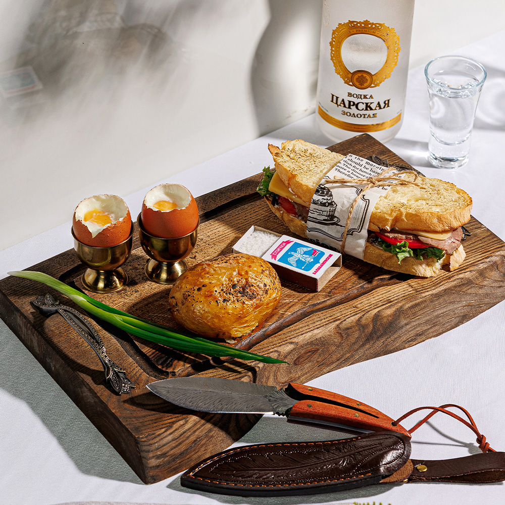 Два отварных яйца с печёным картофелем и сэндвич с ростбифом на домашней чиабатте.